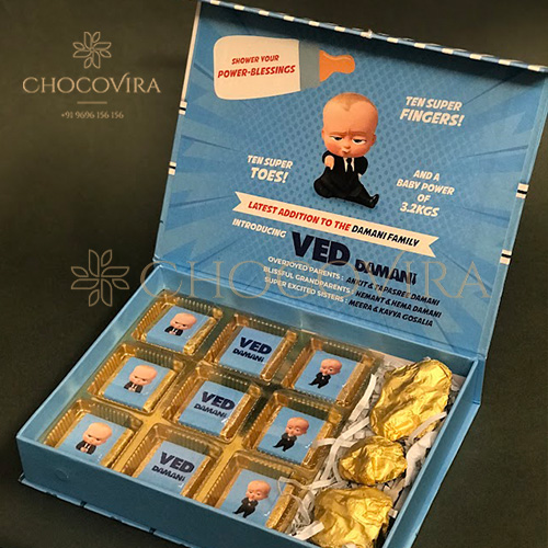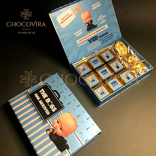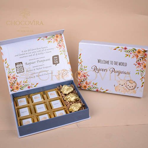 Inside, you will find a delightful selection of gourmet chocolates, carefully chosen to delight your taste buds and help you celebrate the joy of this new addition to our family. Whether you prefer dark, milk or white chocolate, we have something for everyone to enjoy.
